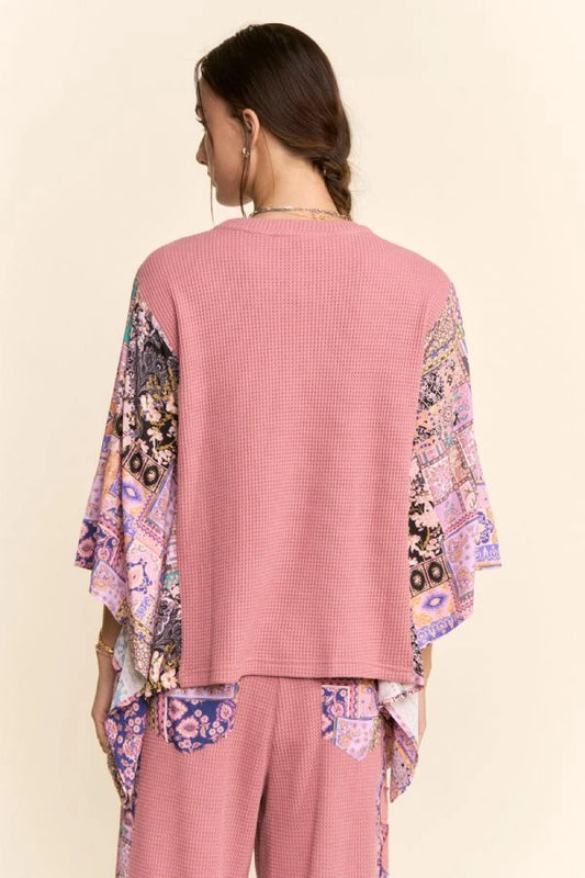 Davi & Dani Waffle Knit Multi-flower Print Sleeves Top